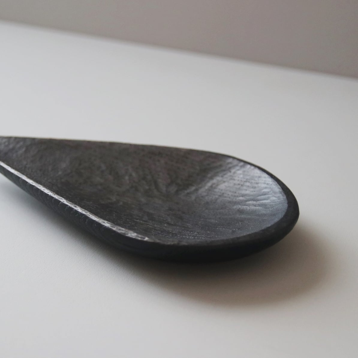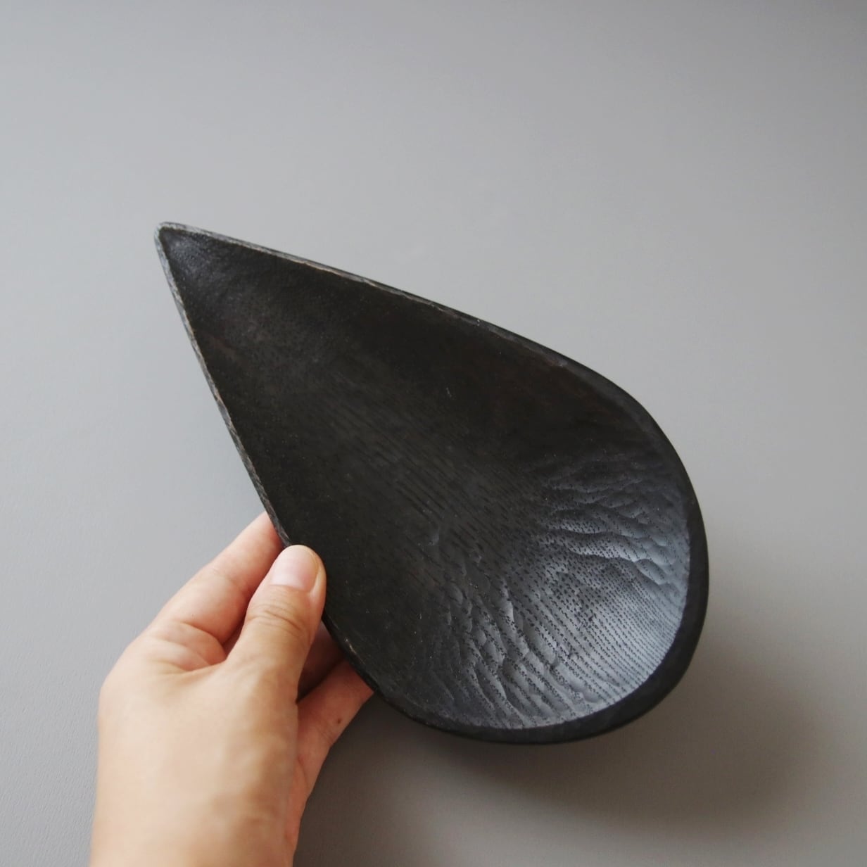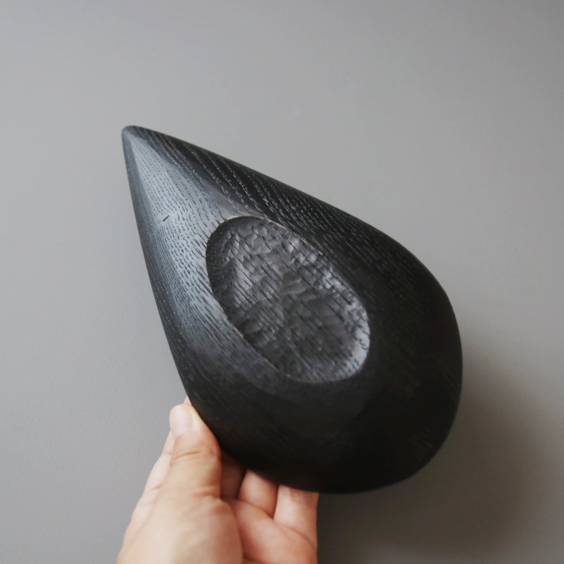 【鉄染め】とは木地に鉄の水溶液を塗り、木に含まれるタンニンとの化学反応により、黒く染める手法です。さらに天然成分をベースとしたオイルを塗り漆黒に仕上げました。渋さ溢れる風合いです。